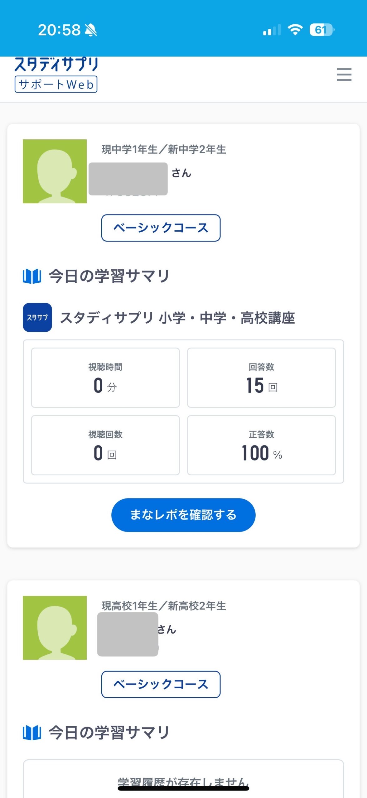 画像のように、一つの画面で兄弟それぞれの学習状況がパッと確認できるんです。